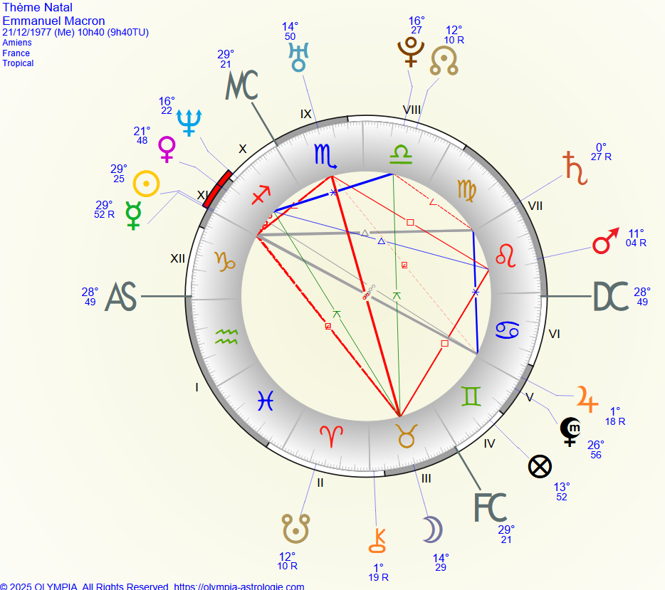 Enfin, n’oublions pas les qualités nécessaires pour persuader un auditoire du bien fondé de ces réformes : le charme et la séduction. Nos deux présidents possèdent cette fabuleuse conjonction Soleil-Venus apportant cette incroyable capacité à désarmer toute opposition, au moins pendant un certain temps, car le charme finit toujours par être rompu lorsque les faits se substituent aux discours et aux éventuelles incantations. Et là, le réveil peut-être fracassant et incompris, aussi bien du côté de ceux qui avaient été séduits que du côté des acteurs politiques eux-mêmes : rappelons-nous la défaite de Valéry Giscard d’Estaing, qui, surpris de sa défaite, ne s’en est pas encore remis presque quarante ans après (petite anecdote) !